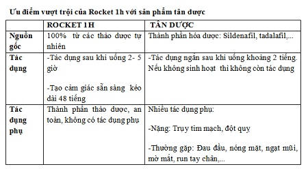 Rocket 1h của Công ty cổ phần Sao Thái Dương ra đời là kết tinh của lý luận Y học cổ truyền kết hợp công nghệ chiết tách, sản xuất hiện đại từ công thức độc đáo của nhiều thảo dược thiên nhiên. Trong thực tế qua kiểm nghiệm đã chứng minh, Rocket 1h có hiệu quả nhanh đối với các trường hợp suy giảm sinh lý nam giới (rối loạn cương dương và xuất tinh sớm) đồng thời lại rất an toàn.