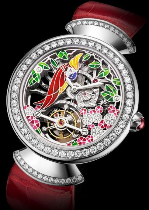 Phiên bản đặc biệt của mẫu đồng hồ Divas’ Dream dành cho mùa lễ hội 2016 với thiết kế lộ thiên trưng diện vẻ đẹp đầy mê hoặc của bộ máy hoạt động bên trong. Hình ảnh chú vẹt – linh vật tượng trưng cho trí tuệ thông thái được khắc họa trên nền màu sắc rực rỡ, vui tươi thầm lan tỏa nguồn năng lượng sống dồi dào tới cảnh vật xung quanh.