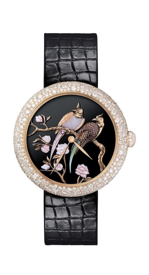 Mẫu đồng hồ Mademoiselle Prive Coromandel với điểm nhấn hình ảnh đôi chim được chế tác ứng dụng kỹ thuật chép hình (glyptic) truyền thống của người Ai Cập trên nền chất liệu vàng hồng beige 18K, xà cừ, đá opal, và đá ngọc bích. Hình ảnh loài chim tượng trưng cho tình duyên, tiền tài, sự may mắn nhưng đồng thời xua đuổi những vận hạn.