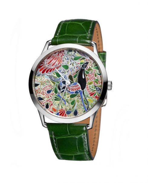 Mẫu đồng hồ Slim d’Hermès Mille Fleurs du Mexique với số lượng hạn chế tôn vinh trường phái nghệ thuật tranh Miniature. Ẩn sau motif tán lá và lông vũ là hình ảnh loài chim được cách điệu mang hơi hướng hình họa sinh động. Những mảng màu giàu biểu cảm và hình ảnh loài chim hòa quyện tượng trưng cho tinh thần và sức sống đầy nhiệt huyết.