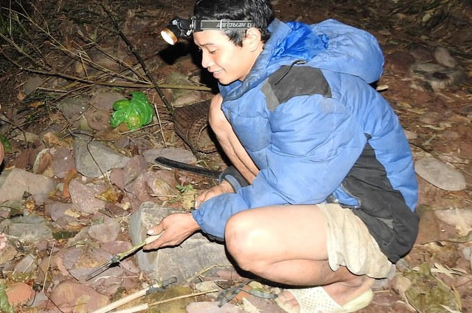 Trong đêm, những mom đá ở khe suối trơn trượt khiến việc đi “săn tôm” không dễ dàng và người thợ lo nhất là gặp rắn độc.