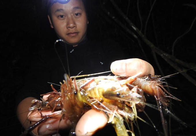 Mỗi đêm, người thợ đi săn khoảng ba tiếng, kiếm được từ 2 đến 3 kg tôm.