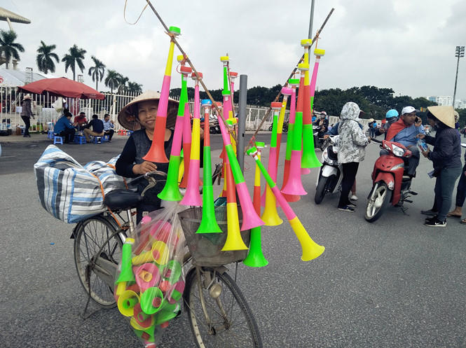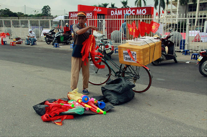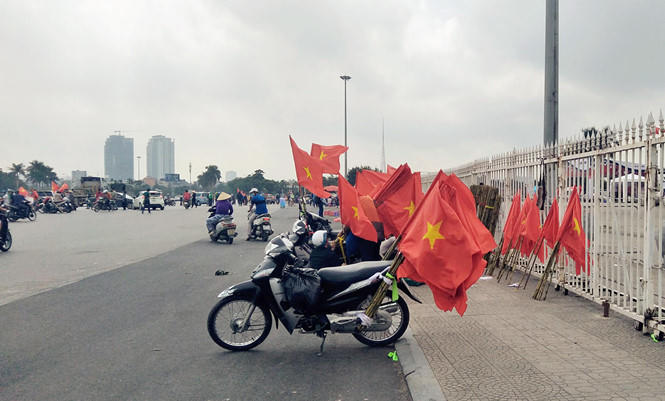 Từ trưa, hàng chục điểm bán cờ lưu động trước sân đã tấp nập sẵn sàng phục vụ người hâm mộ đến sân cổ vũ cho đội tuyển Việt Nam. Dọc trục đường Lê Đức Thọ kéo dài cũng có nhiều điểm bán cờ, kèn, băng rôn...