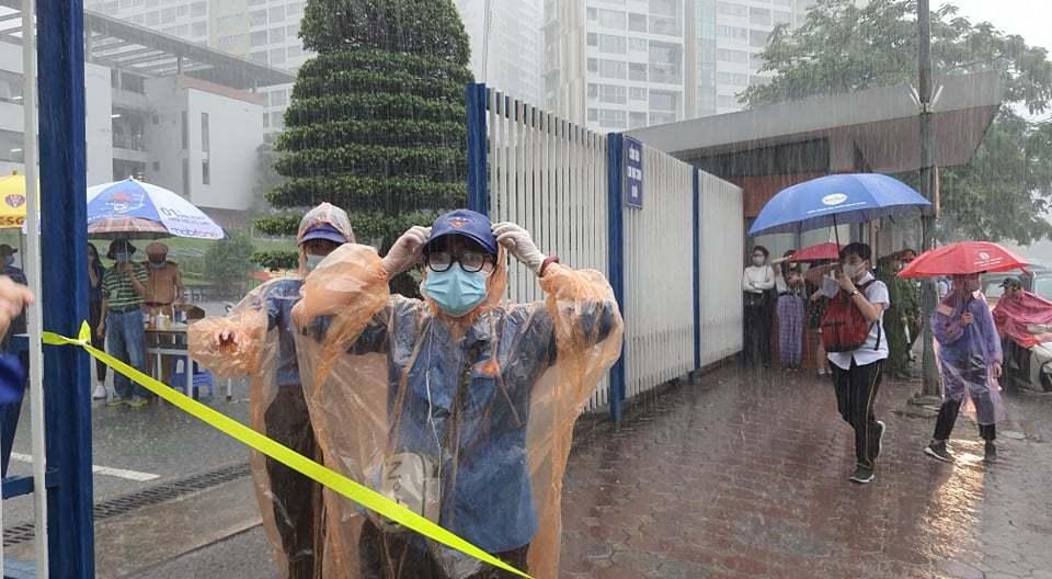 | Mưa như trút nước ở điểm thi Trường THPT Chuyên Hà Nội - Amsterdam. Ảnh: Thanh Hùng |