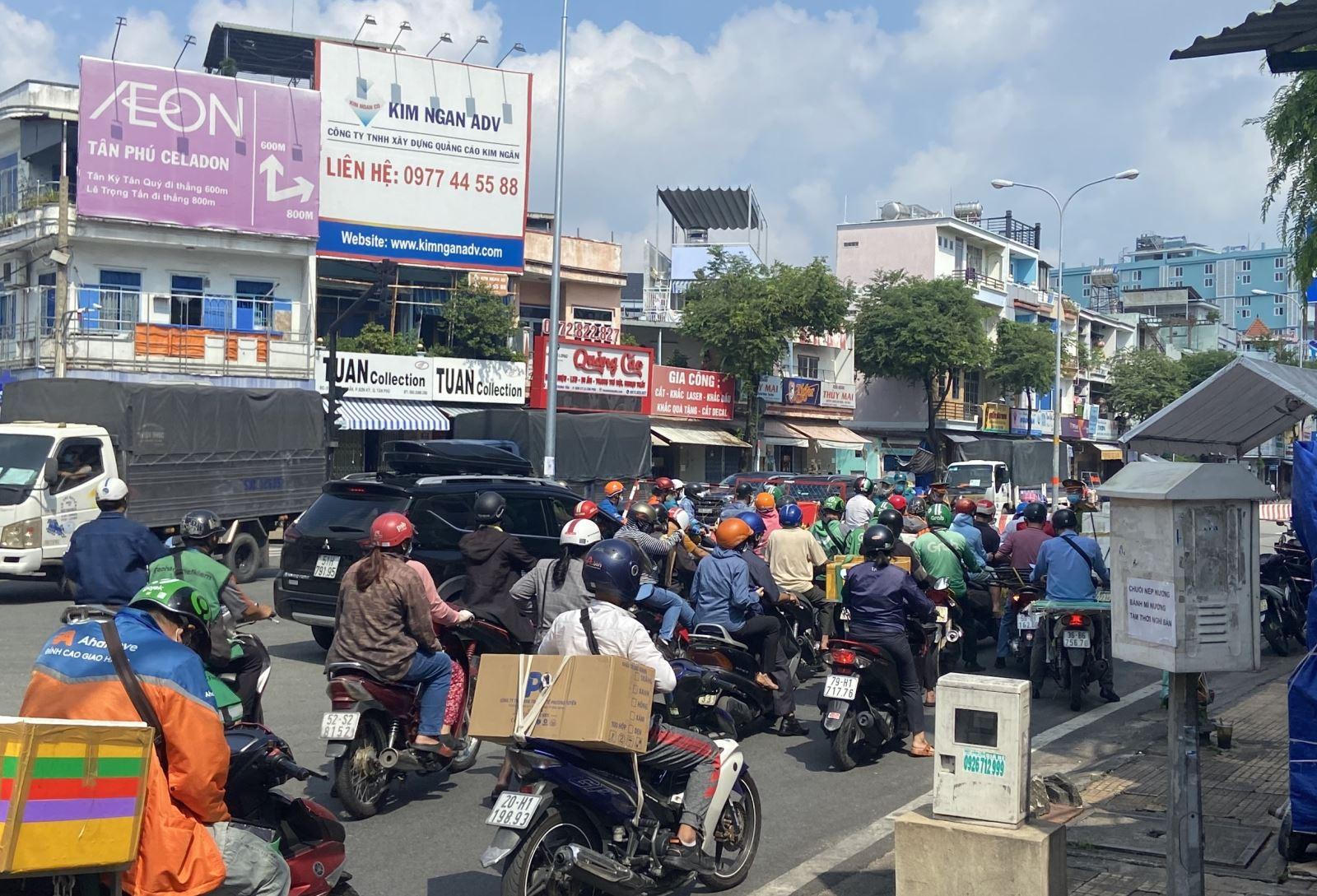 Đường Tân Kỳ Tân Quý (quận Tân Phú) đông đúc xe cộ qua lại trong sáng 21/8.