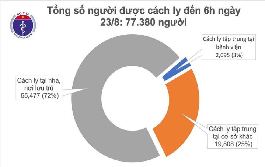 Tổng số người tiếp xúc gần và nhập cảnh từ vùng dịch đang được theo dõi sức khỏe (cách ly): 77.380, trong đó: Cách ly tập trung tại bệnh viện: 2.095; Cách ly tập trung tại cơ sở khác: 19.808; Cách ly tại nhà, nơi lưu trú: 50.477.
