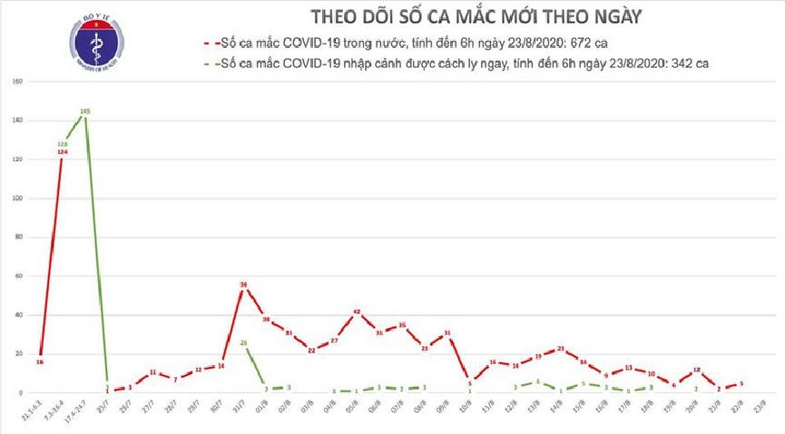 Tính đến 6h ngày 23/8, Việt Nam có tổng cộng 672 ca mắc Covid-19 do lây nhiễm trong nước, trong đó số lượng ca mắc mới liên quan đến Đà Nẵng tính từ ngày 25/7 đến nay: 532 ca.