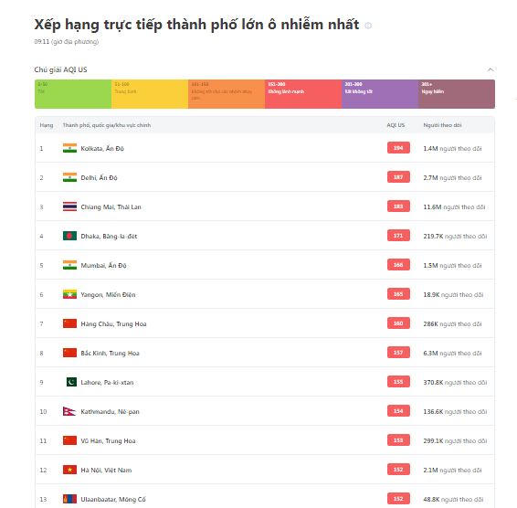 Trong bảng xếp hạng trực tiếp thành phố lớn ô nhiễm nhất trên thế giới, sáng nay Hà Nội ở vị trí 12, trong khi hôm qua (6/3) Hà Nội đứng đầu bảng xếp hạng này.