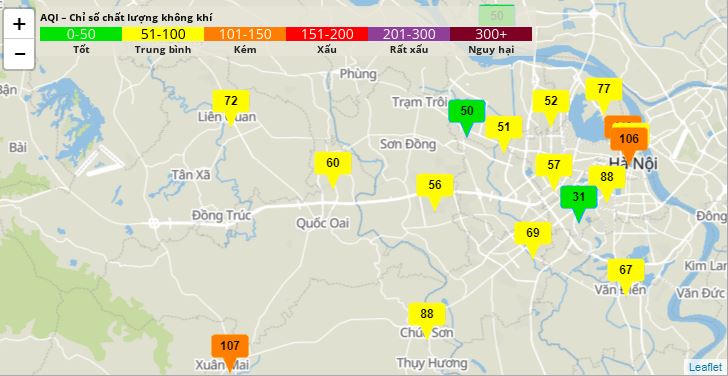 Ngoài ra, theo Cổng thông tin quan trắc môi trường Thủ đô Hà Nội, sáng nay hầu hết các vị trí đo, chất lượng không khí đều ở mức trung bình, chỉ có 3 điểm chất lượng không khí ở mức kém, gồm: UBND thị trấn Xuân Mai, Chương Mỹ, Đông Kinh Nghĩa Thục, Hàng Đậu.