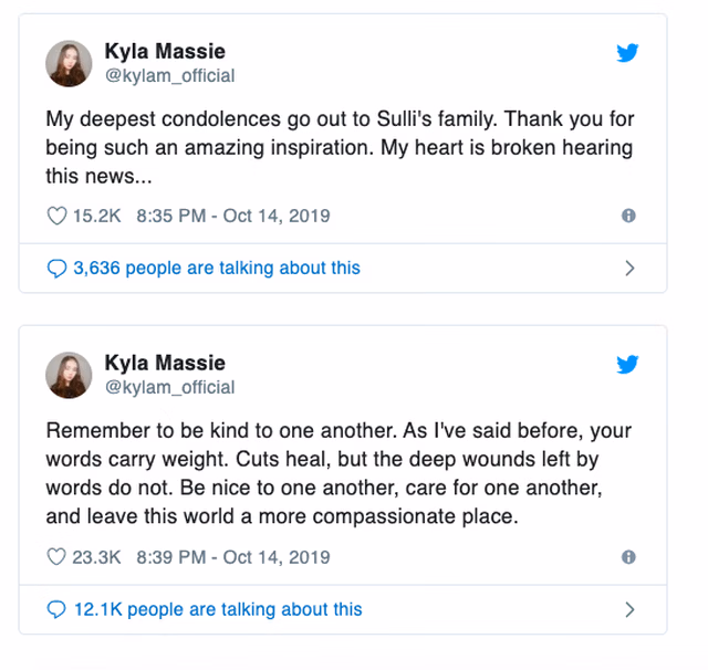 Trong khi nam diễn viên Shin Hyun Joon, một “đàn chú” của Sulli thì viết: “Một con người quý giá khác đã rời bỏ chúng ta. Những lời bình luận ác ý. Bạn chính là những kẻ giết người hèn nhát và vô danh”.