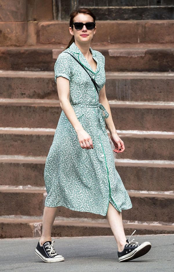 Emma Roberts cũng chọn họa tiết nhí cho kiểu váy cuốn trẻ trung của mình mix cùng sneakers năng động khi dạo phố.