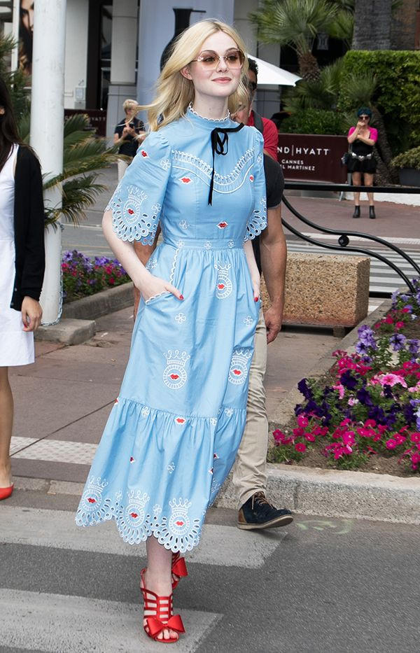 Elle Fanning duyên dáng với đầm dài, cổ trụ màu xanh da trời và sandal cao gót đỏ nổi bật.