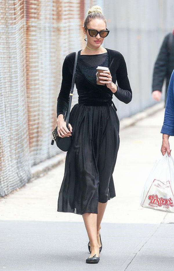 Candice Swanepoel khoe vóc dáng thon gọn sau sinh với chân váy xếp ly, áo nhung mặc ngoài và giày bệt.