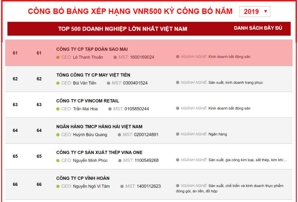 Sao Mai Group lọt TOP 100 doanh nghiệp lớn nhất Việt Nam 2019