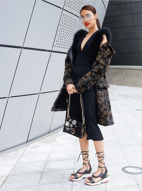 | Lan Khuê "chất lừ" tại Tuần lễ thời trang Seoul. Cô chọn váy hiệu Salvatore Ferragamo, áo khoác Versus Versace, giày Salvatore Feragamo, túi Jimmy Choo và mắt kính Chanel. |