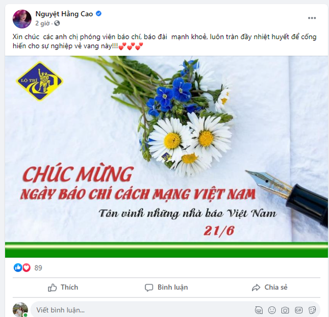 Từ phía diễn viên Nguyệt Hằng - bà Hoài trong "Hãy nói lời yêu" đăng hình chúc mừng ngày 21/6 kèm lời chúc:"Xin chúc các anh chị phóng viên báo đài mạnh khỏe, luôn tràn đầy nhiệt huyết để cống hiến cho sự nghiệp vẻ vàng này".