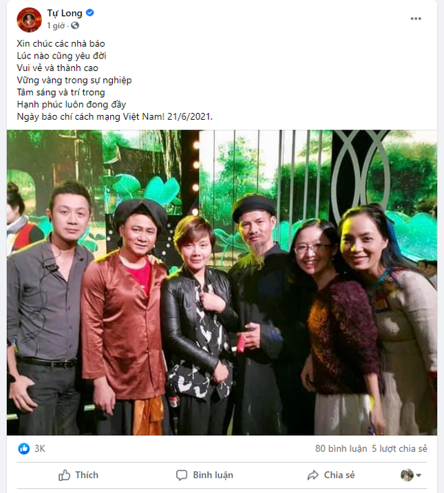 Trên trang cá nhân, NSND Tự Long gửi lời chúc tới các nhà báo bằng bài thơ "Xin chúc các nhà báo / Lúc nào cũng yêu đời / Vui vẻ và thanh cao / Vững vàng trong sự nghiệp / Tâm sáng và trí trong / Hạnh phúc luôn đong đầy/ Ngày báo chí cách mạng Việt Nam! 21/6/2021