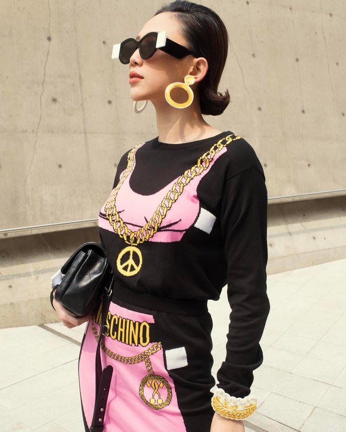 Tóc Tiên vừa "bánh bèo" lại gợi cảm và phá cách với trang phục sắc đen in họa tiết "độc" của thương hiệu thời trang Moschino. Đôi giày cao gót tiệp màu trang phục tạo sự đồng điệu cực nữ tính cho vẻ ngoài.