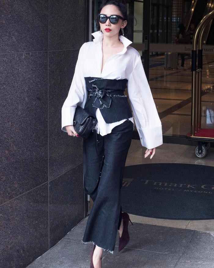 Mốt áo corset được nữ ca sĩ ứng dụng thành thục với trang phục mang hơi hướng cổ điển gồm những item đơn giản như quần denim ống rộng, áo sơ mi oversize kết hợp túi xách Chanel.