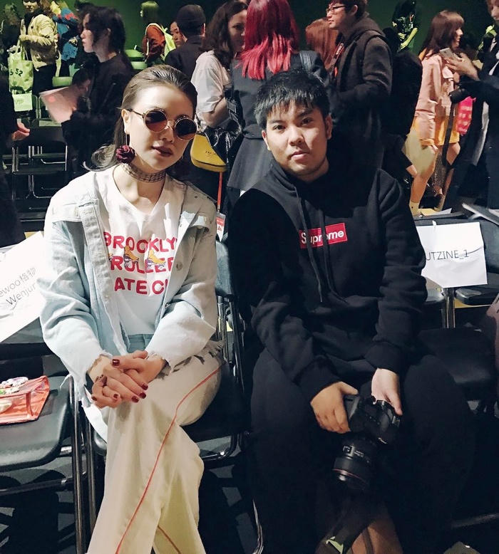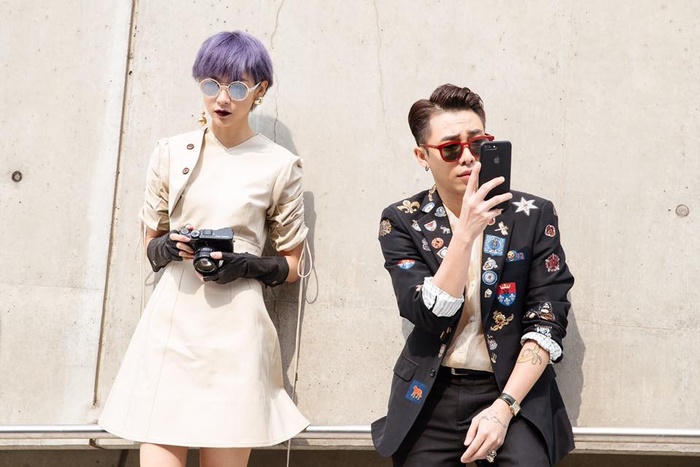 Hoàng Ku luôn đồng hành cùng Phí Phương Anh khi đi show tại Seoul Fashion Week lần này. Bộ suit đính sticker ton-sur-ton với nàng mẫu giúp bộ đôi ghi điểm về trang phục ăn ý.