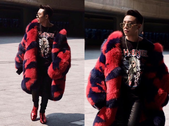 Hoàng Ku nổi bật tại Seoul Fashion Week với áo lông phối màu giá 500 triệu và ankle boot đỏ rực rỡ.