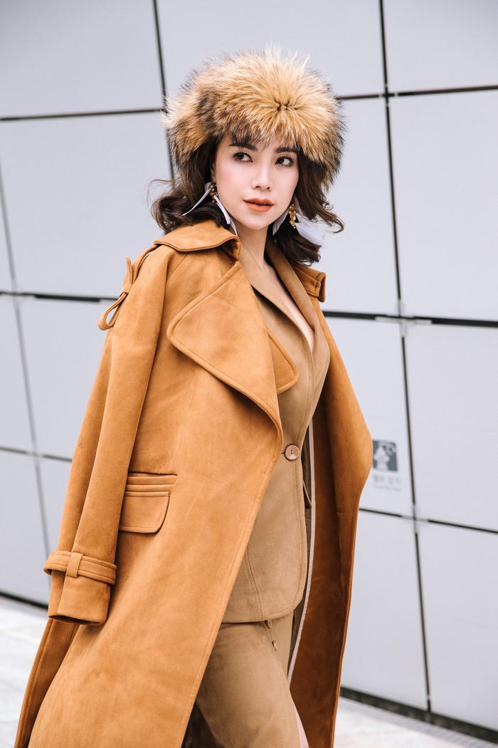 Người đẹp Trà Ngọc Hằng khoác nguyên một set đồ màu nâu bò cực sang khi dự Tuần lễ thời trang Seoul 2017. Set trang phục này rất phù hợp với thời tiết lạnh giá của Hàn Quốc ở thời điểm hiện tại.