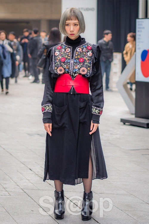 Từ sau khi "lột xác" sang hình ảnh cô nàng tóc tém cá tính, Phí Phương Anh cũng có bước đột phá về mặt phong cách. Lần đầu tiên xuất hiện tại sự kiện thời trang lớn của Hàn Quốc, quán quân The Face nhờ cậy đến sự hỗ trợ của stylist Hoàng Ku.