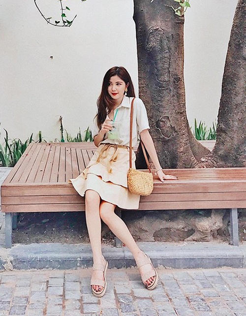 Với bộ váy hoa, cô dùng túi cói đính những cục bông tròn, đem lại vẻ trẻ trung.