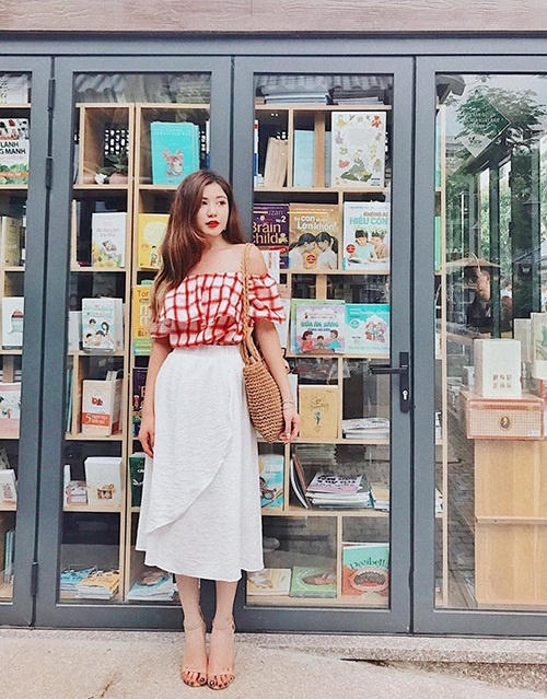 Túi tre hình nửa vầng trăng được hot girl Sun Ht kết hợp cùng giày đế xuồng và váy đỏ.
