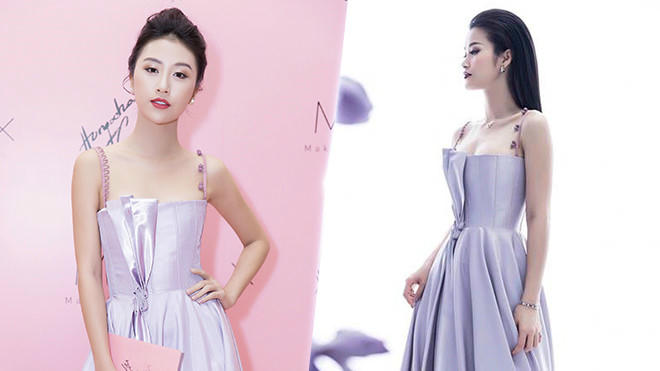 Quỳnh Anh Shyn nữ tính cùng lối trang điểm nhẹ nhàng, còn Đông Nhi cá tính với đôi môi tím, ánh mắt khói sắc sảo khi diện chung mẫu váy hai dây cúp ngực.