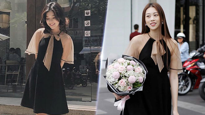 Hoàng Yến Chibi và người mẫu Kikki Lê vô tình lựa chọn chung mẫu váy xòe sắc đen cùng thắt nơ nữ tính trên cổ. Tuy nhiên, nữ diễn viên Tháng năm rực rỡ lại trẻ trung hơn với lối trang điểm nhẹ nhàng, cùng mái tóc ngắn uốn xoăn gợn sóng.