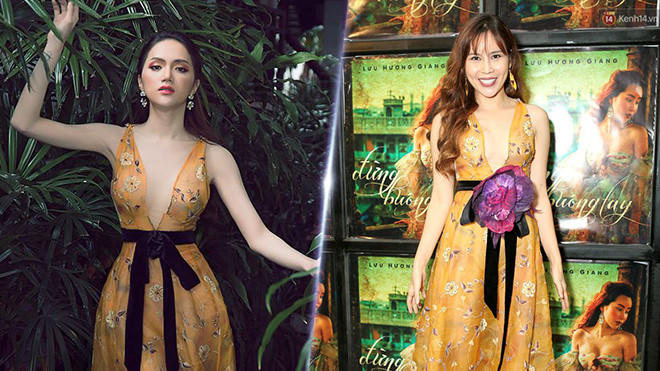 Hoa hậu Chuyển giới 2018 tiếp tục đụng hàng nữ ca sĩ Lưu Hương Giang trong chiếc váy sắc vàng xẻ ngực sâu gợi cảm. Tuy nhiên, giọng ca Get High lại nổi bật với mẫu hoa to bản đính kết ngay thắt eo.