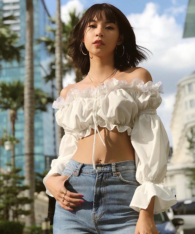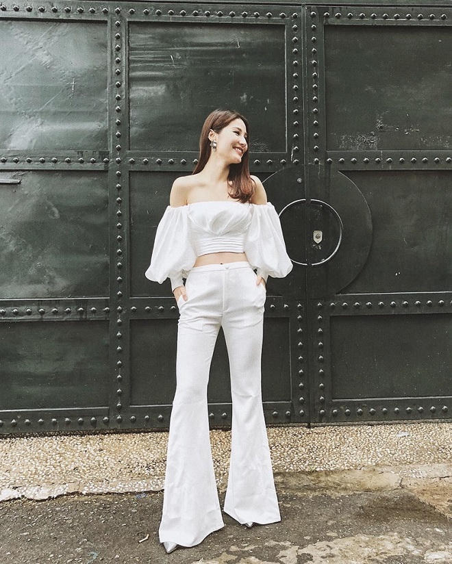 Xu hướng thời trang thập niên 1980 đang trở lại trong mùa hè năm nay. Đơn cử như những chiếc áo sơ mi tay phồng cổ điển của giới quý tộc châu Âu thời kì Victoria. Kiểu trang phục mang đến cho phái nữ nét cổ điển, nữ tính và tôn được vẻ tinh tế của bản thân. Diễm My gợi cảm trong set đồ trắng nhã nhặn. Mẫu crop-top tay phồng giúp người đẹp khoe khéo bờ vai và vòng eo thon gọn.
