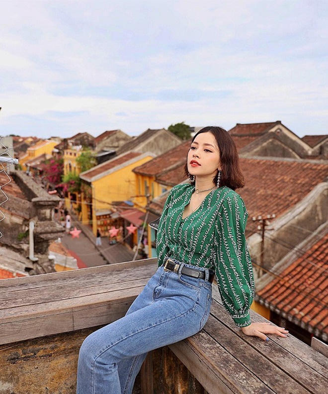 Người mẫu Phí Phương Anh khéo léo khoe vòng eo thon gọn với chiếc áo sơ mi tay phồng cổ điển đi kèm quần jeans lưng cao. Kết hợp nhiều phụ kiện như nhẫn, vòng cổ hay khuyên tai cũng giúp bộ cánh trông sành điệu hơn.