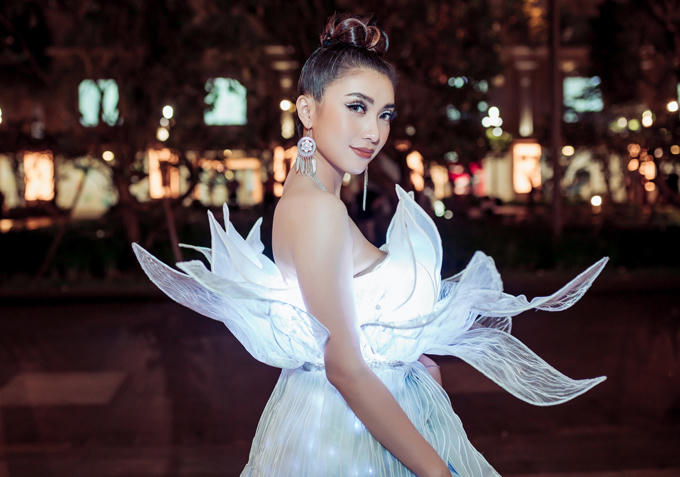 Tiêu Châu Như Quỳnh diện váy tạokhối cánh hoa được cài 3.000 chiếc đèn led khiến khán giả lầm tưởng nữ ca sĩ đang tham dự lễ hội hóa trang hơn là tiệc trao giải của năm. |