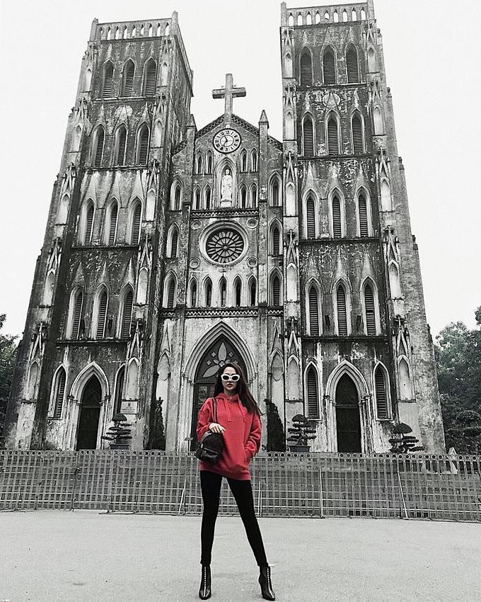 Set đồ gồm skinny jeans và áo hoodie giúp Bảo Anh toát lên vẻ năng động, trẻ trung.