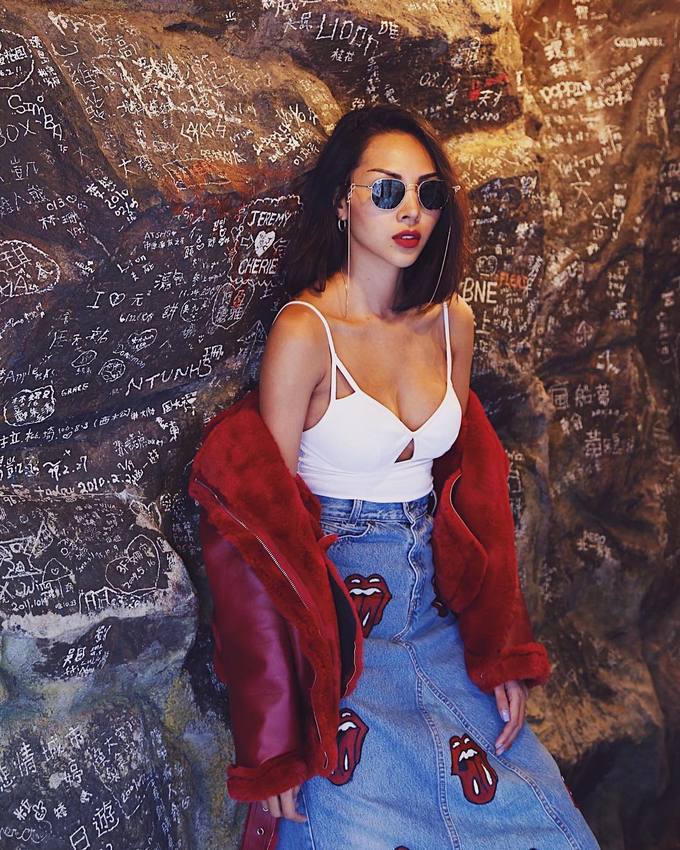 Minh Triệu khoe hình thể nóng bỏng với bra trắng và áo khoác da đỏ.