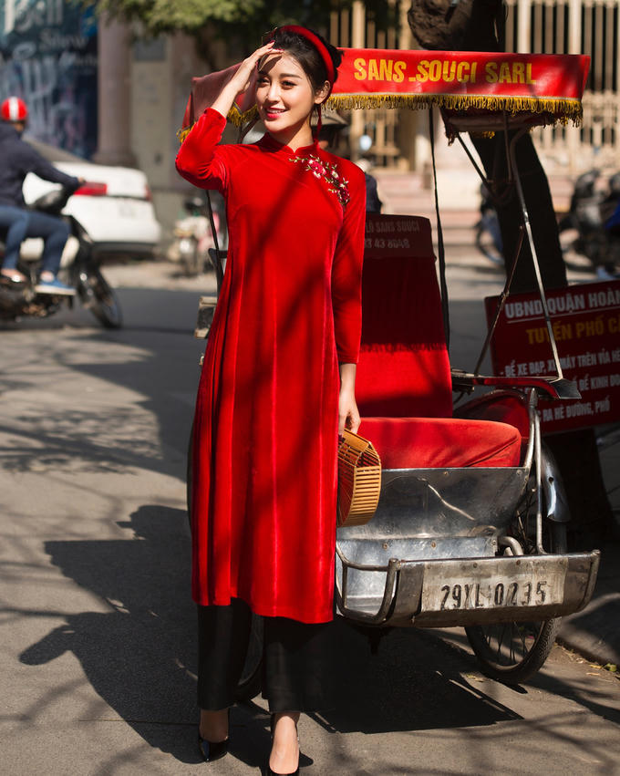 Á hậu Huyền My kết hợp áo dài cách tân với mấn đội đầu và túi đan tre hình bán nguyệt. Đây cũng là một trong những trang phục do chính cô thiết kế.