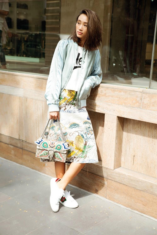 Áo bomber được kết hợp với chân váy in họa tiết hổ độc đáo. Set đồ mang lại hình ảnh khỏe khoắn nhưng không kém phần nữ tính cho Trang Khiếu.