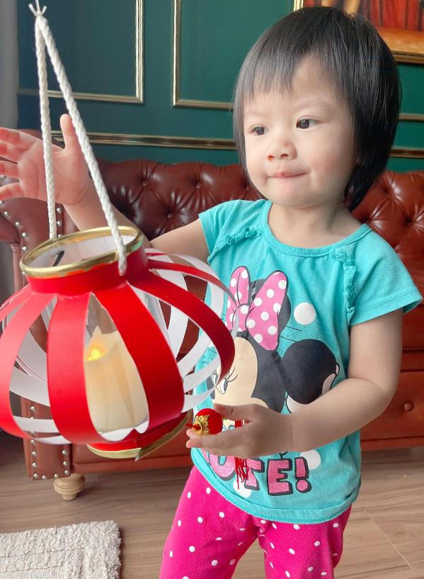Mọi năm, Trịnh Kim Chi và chồng chở con gái thứ hai - Khánh Vy (sáu tuổi) - đến phố lồng đèn quận 5, TP HCM, để bé được vui chơi. Năm nay, vì dịch, cả nhà quây quần bên nhau phá cỗ đêm trăng rằm. Không thể ra ngoài mua đồ, diễn viên tận dụng đồ học tập của con như giấy màu, keo dán làm đèn giấy con cá.