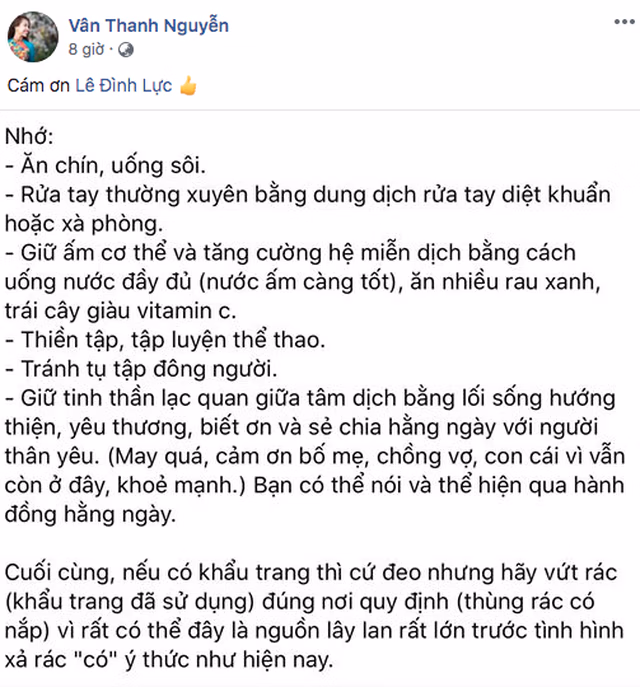 Tôi tập thở, tập yoga, chạy bộ hằng ngày. Rửa mũi, súc miệng với nước muối sinh lý. Ăn uống, ngủ đúng giờ. Suy nghĩ tích cực, thế thôi ạ, cái gì đến thì đến, bình tĩnh đón nhận và vượt qua. Không phải loài mạnh nhất hay loài thông minh nhất sẽ sống sót mà là loài có năng lực thích nghi cao nhất - Charles Darwin”.
