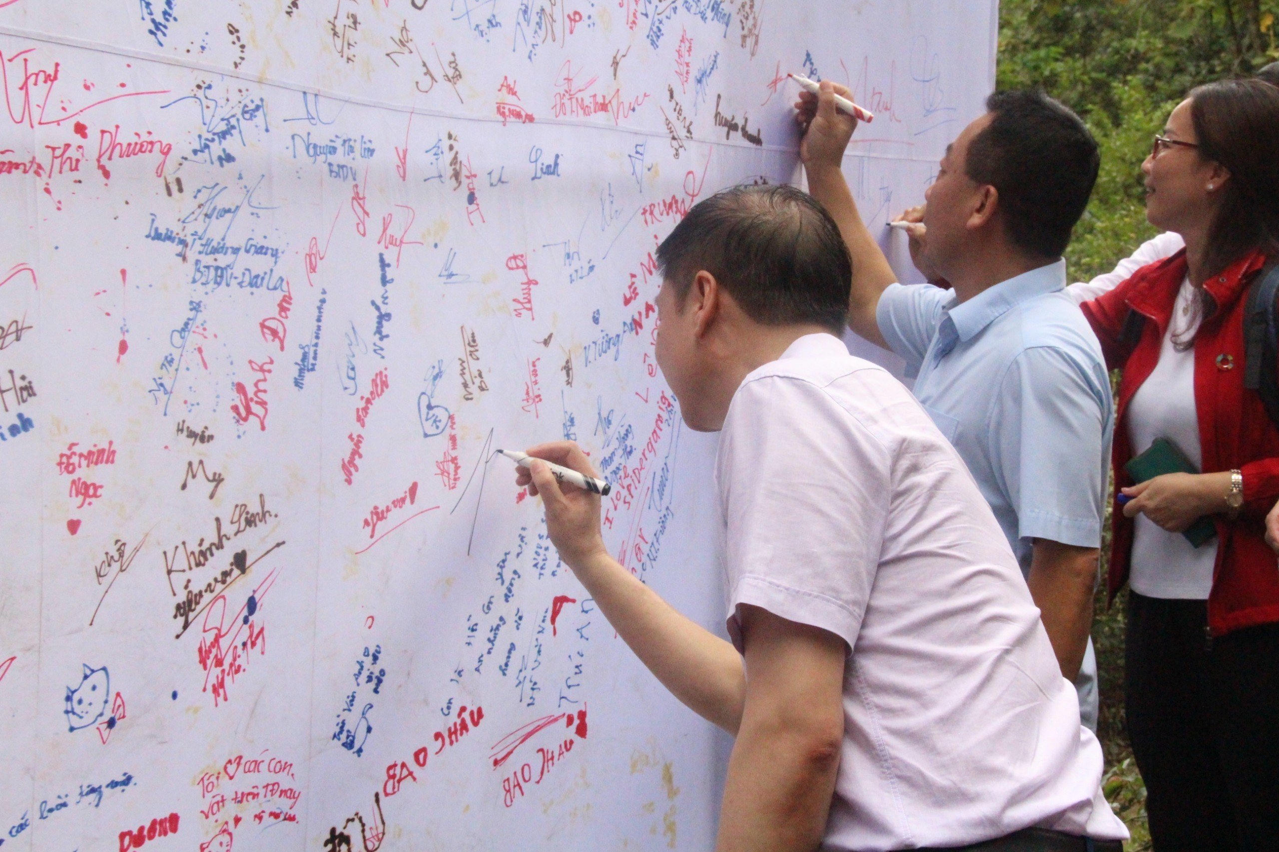 | Bộ trưởng Lê Minh Hoan và các đại biểu ký cam kết bảo vệ voi trong chuyến đi thực địa tại Vườn quốc gia Pù Mát, Nghệ An từ ngày 28-30/7/2023. |