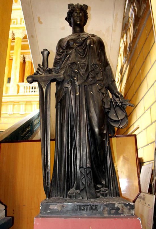 Là nơi để xét xử, bảo vệ công lý của xã hội nên tòa nhà này được xây dựng theo phong cách riêng biệt nhằm đảm bảo tính uy nghiêm của công lý. Từ các phòng xử cho tới các bức tượng đặt ở hành lang đều thể hiện được sự tôn nghiêm chốn công đường. Ở tầng trệt ngay sảnh chính được bố trí 2 bức tượng lớn. Tượng được bố trí hai bên chân cầu thang dẫn lên tầng hai. Bên phải là tượng nữ thần Công lý, bên trái là tượng nữ thần Đoàn kết. Ở tầng trên được bố trí 4 bức tượng lớn, nhưng không hiểu vì lý do gì mà mất một bức tượng bên cánh trái.