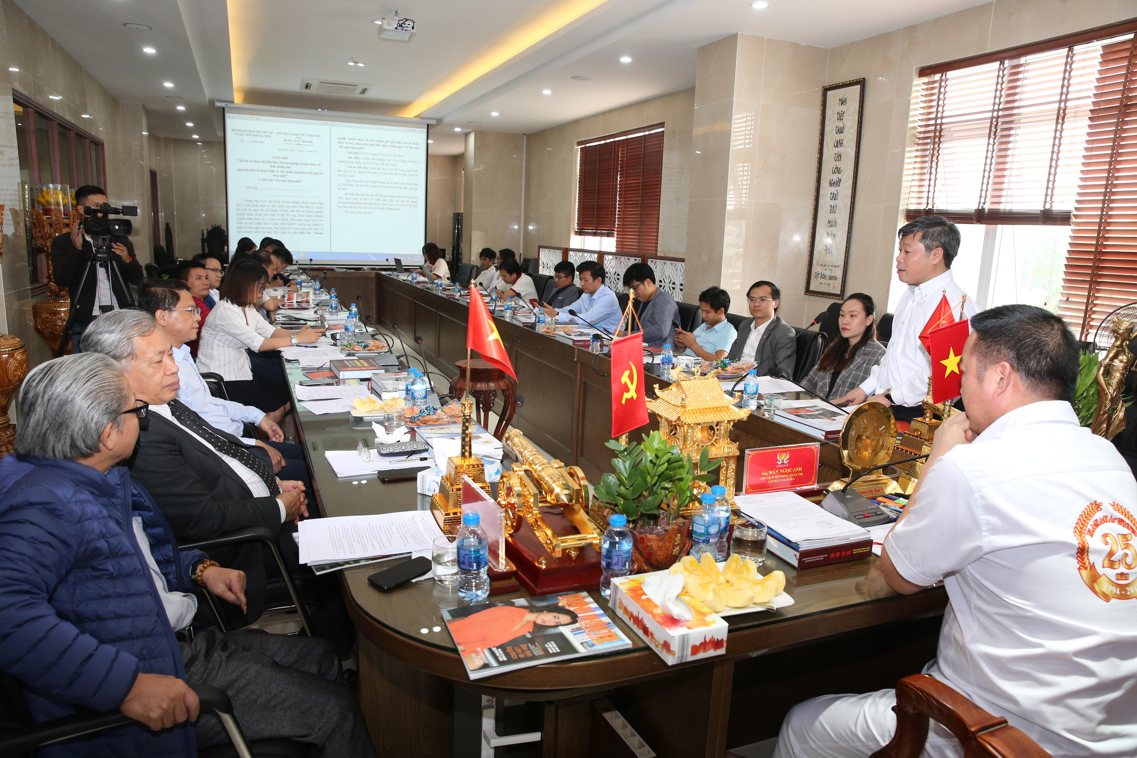 (PLVN) - Chiều ngày 30/11/2019, tại trụ sở Công ty Cổ phần Tập đoàn Hanaka, thị xã Từ Sơn (Bắc Ninh), ông Mẫn Ngọc Anh, Chủ tịch Tập đoàn Hanaka, Chủ tịch Hội Doanh nhân trẻ tỉnh Bắc Ninh chủ trì Hội nghị thông báo Kế hoạch tổ chức Diễn đàn “Doanh nghiệp, doanh nhân các tỉnh, thành phố phía Bắc hiến kế hoàn thiện cơ chế, chính sách phát triển kinh tế làng nghề”.