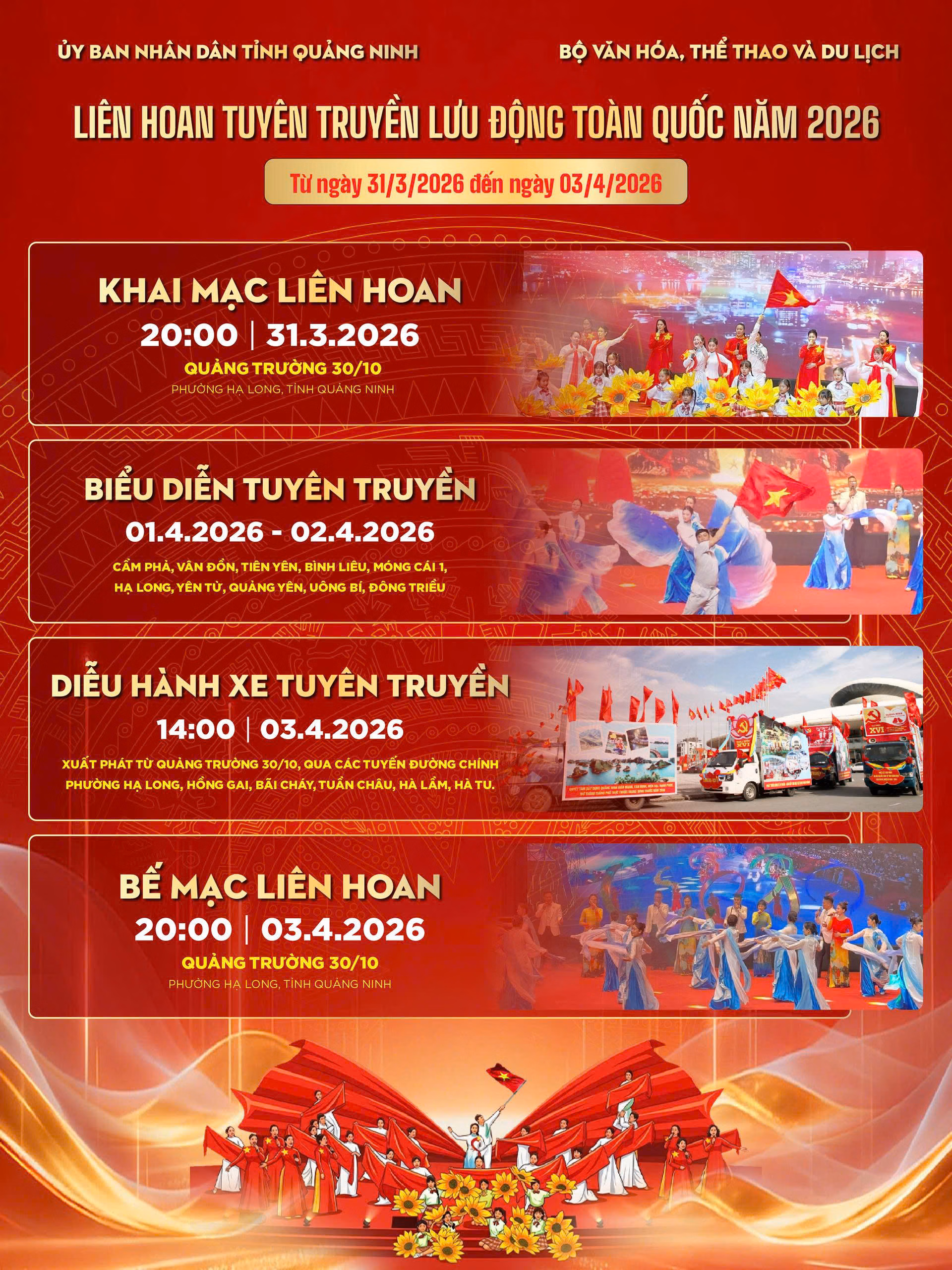 (PLVN) – Từ ngày mai (31/3 đến 03/4), tại Quảng Ninh sẽ diễn ra Liên hoan Tuyên truyền lưu động toàn quốc năm 2026 do Bộ Văn hóa, Thể thao và Du lịch phối hợp tổ chức.