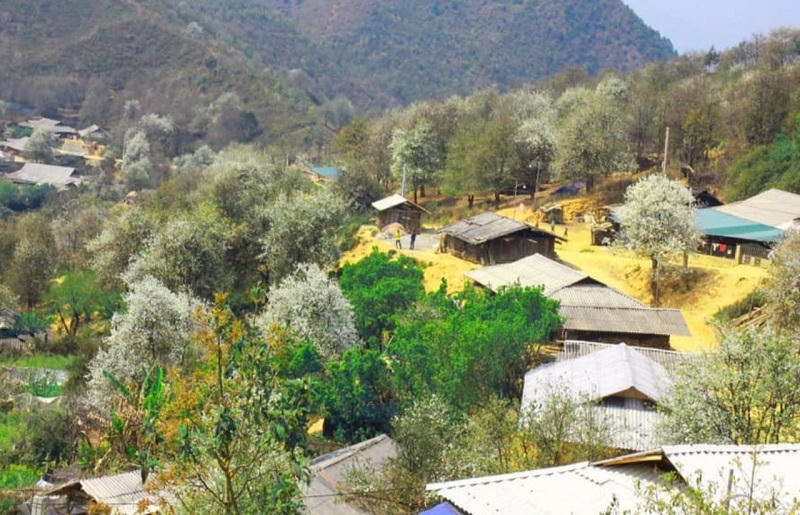 Bản Nậm Nghiệp, xã Ngọc Chiến, huyện Mường La, bao phủ màu trắng của hoa sơn tra. |