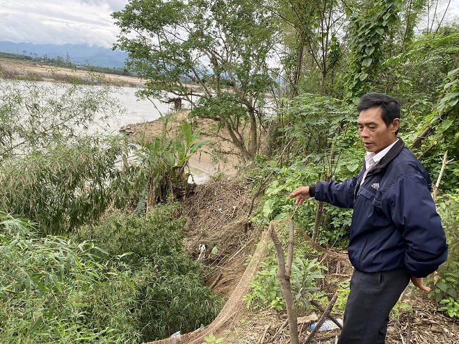 Căn nhà của ông nay chỉ cách mép sông khoảng 3m. Nguy cơ chỉ cần thêm đợt lũ nhỏ, căn nhà sẽ ụp xuống sông. Đất canh tác ven sông vốn là kế sinh nhai của những hộ dân tại đây cũng không còn. Một số đất vườn, đất bãi bồi đã trở thành lòng sông. Con đường liên xóm, nay mép sông đã tiến sát chân đường.