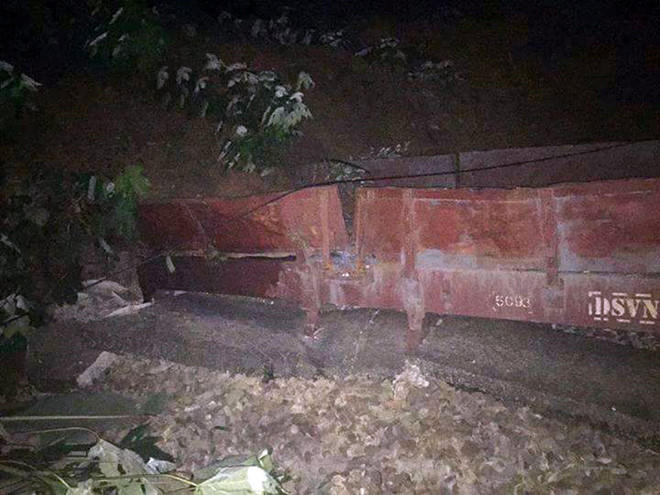 (PLO) - Đoàn tàu đang chờ bốc hàng tại một nhà ga ở Yên Bái bất ngờ bị đất sạt lở xuống xô tàu trật bánh khỏi đường ray, khoảng 7 toa bị vùi lấp. Tuyến đường sắt Hà Nội - Lào Cai tê liệt.