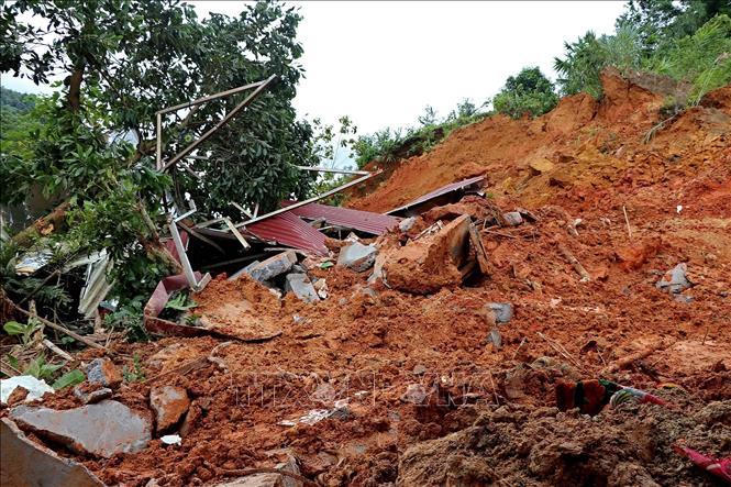 Căn nhà bị đất đồi sạt lở vùi lấp hoàn toàn. Ảnh: Thanh Hải - TTXVN