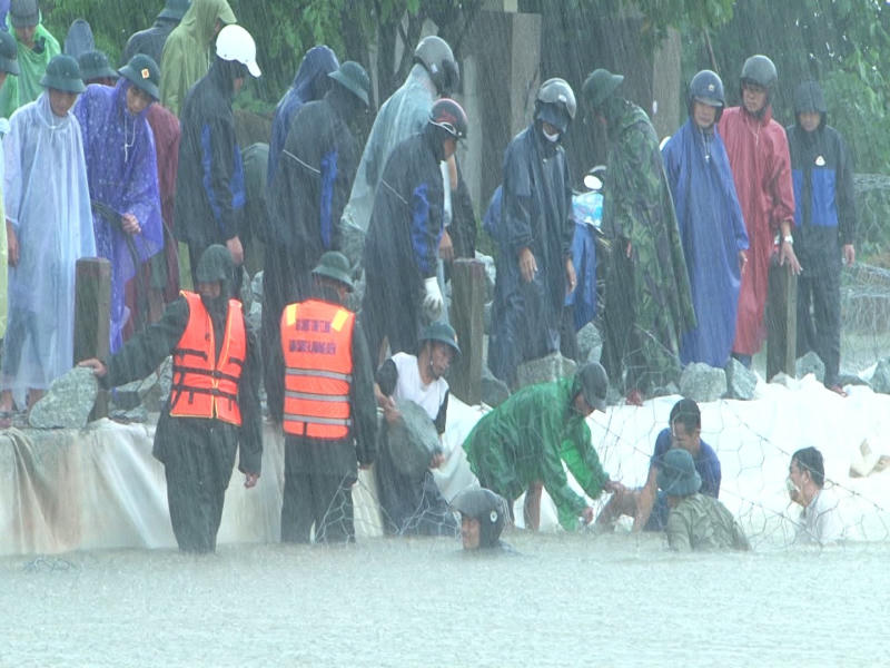Mặc dù trời mưa rất to, nước sông chảy xiết, việc xếp kè rọ đá vào vị trí sạt bị sạt lở rất khó khăn nhưng cán bộ, chiến sĩ Quân đội, Công an và các lực lượng phải ngâm mình dưới nước nhiều giờ với quyết tâm không để vỡ đê. Hiện, công tác chống sạt lở đoạn đê, bảo đảm an toàn cho người dân địa phương đã hoàn thành.